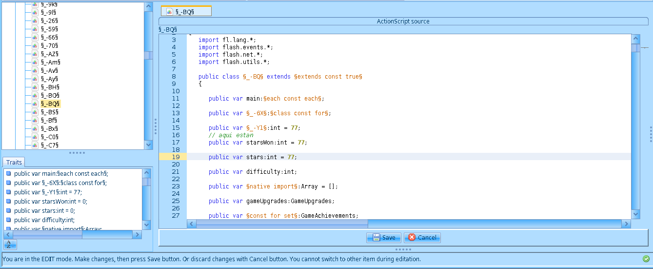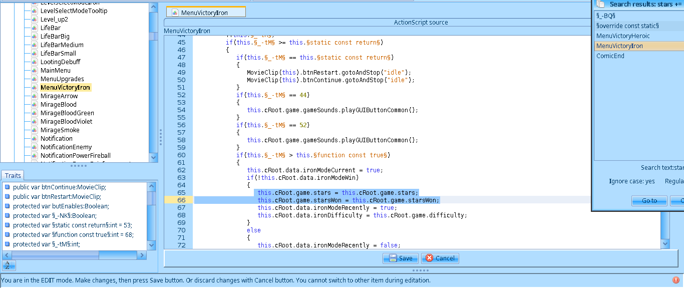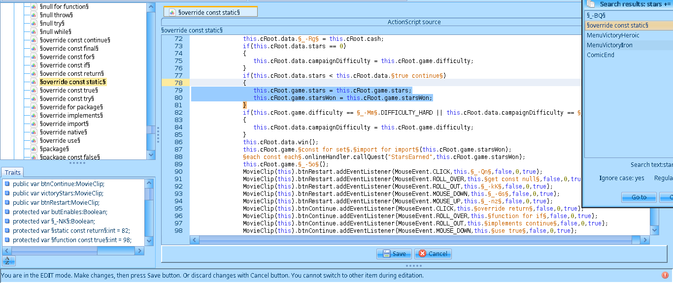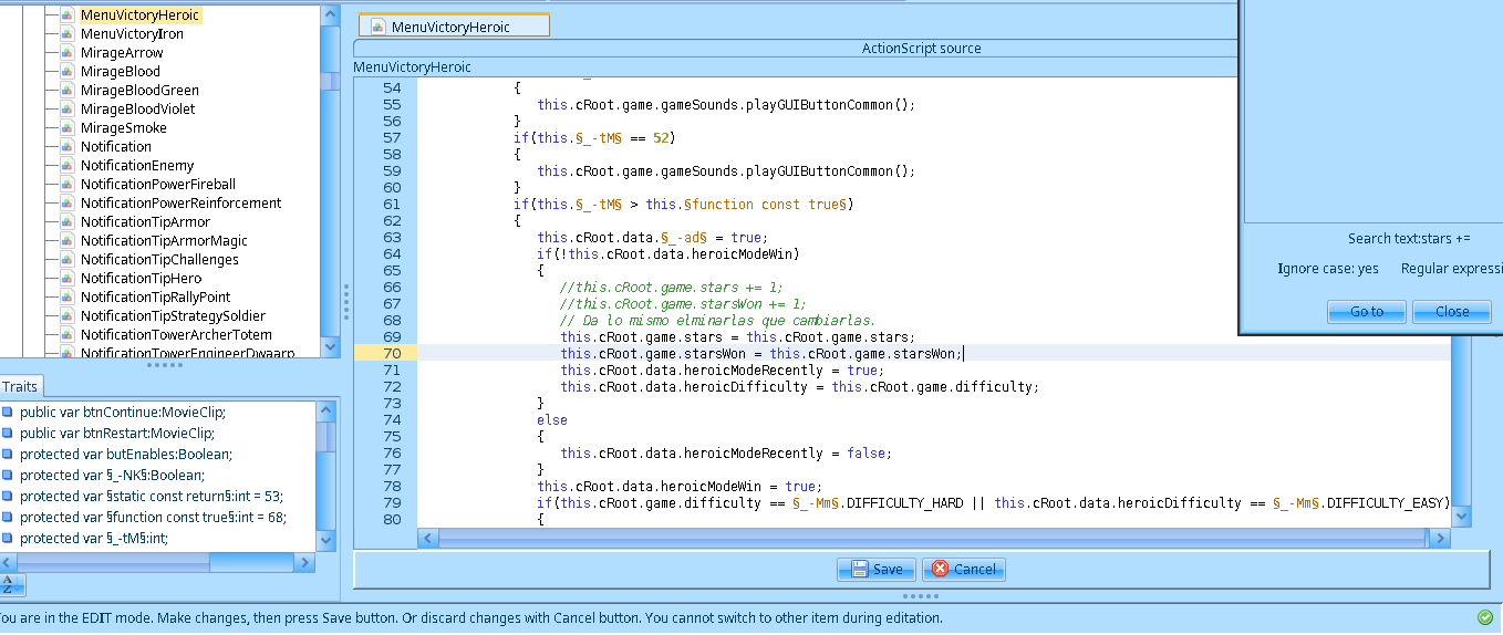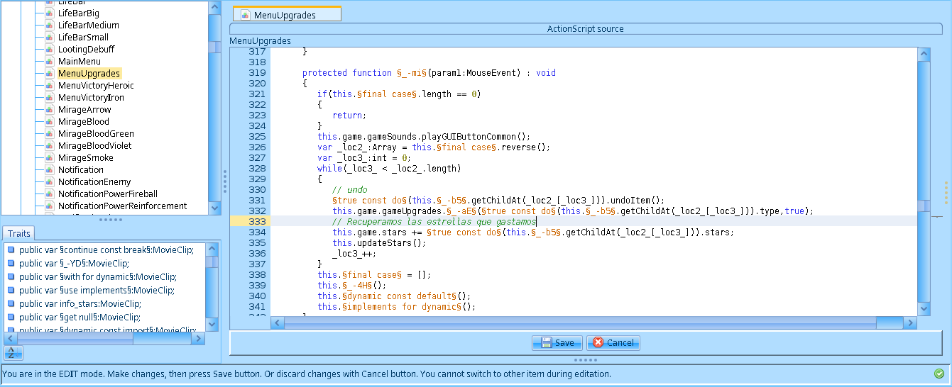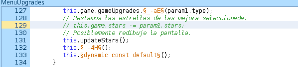 Antes de revisar los cambios actualicé en el script MenuUpgrades las lineas this.game.stars += §true const do§(this.§_-b5§.getChildAt(_loc2_[_loc3_])).stars; y this.game.stars -= param1.stars; por this.game.stars = this.game.stars; para mantener el numero de estrellas inmutable.