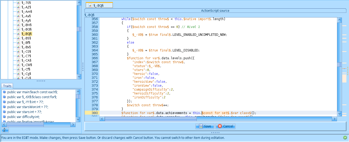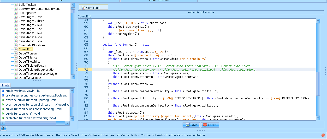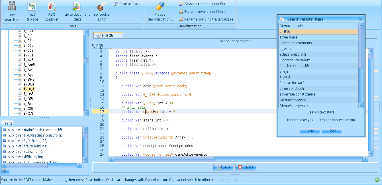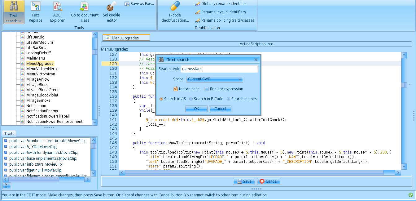 Antes de revisar los cambios actualicé en el script MenuUpgrades las lineas this.game.stars += §true const do§(this.§_-b5§.getChildAt(_loc2_[_loc3_])).stars; y this.game.stars -= param1.stars; por this.game.stars = this.game.stars; para mantener el numero de estrellas inmutable.