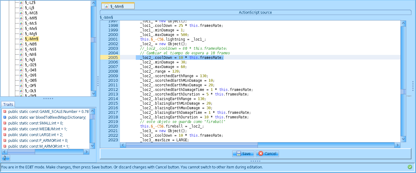 Filtrando por la palabra “fireball” eventualmente encontré que el script §_-Mm§ contiene las características de muchos elementos del juego, incluyendo las habilidades fireball y reinforcement (esta con valores para varios niveles de la habilidad).